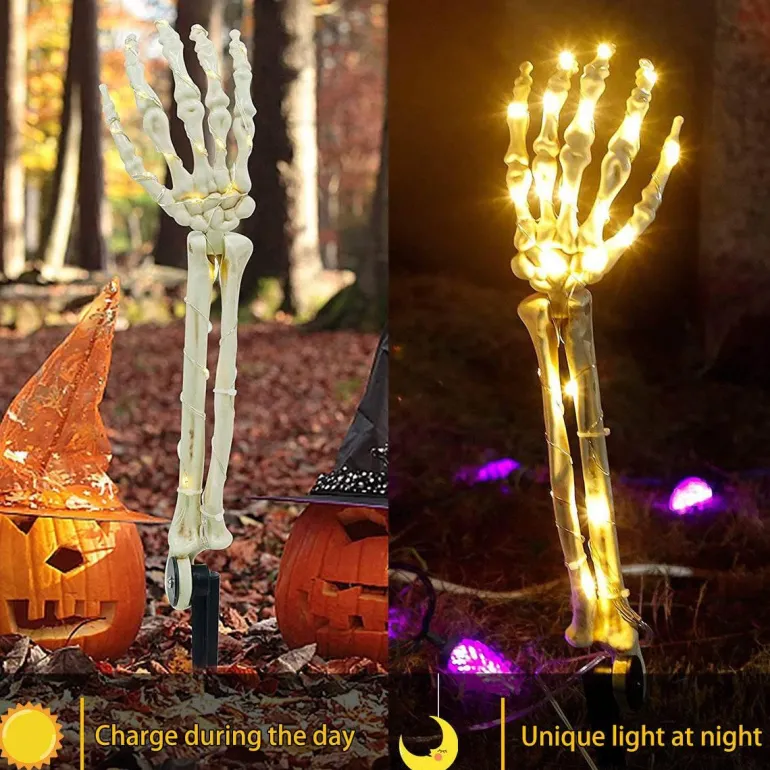 Verwandeln Sie Ihre Außenumgebung mit diesen bezaubernden Solarleuchten mit Skelettarm, die sich perfekt dazu eignen, zu Halloween und darüber hinaus eine festliche und einladende Atmosphäre zu schaffen.
