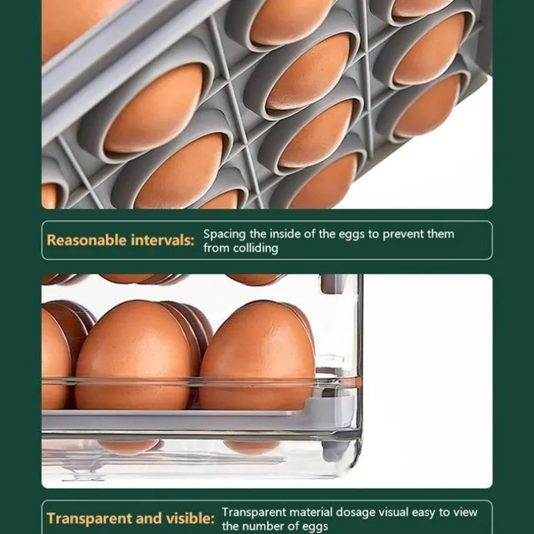 Jedes Fach ist für verschiedene Eiersorten geeignet, darunter Hühner- und Enteneier, und bietet so eine sichere und sorgenfreie Lagerung. Die unabhängigen Schichten sind so konzipiert, dass sie Bewegungen reduzieren und das Risiko von Kollisionen zwischen Ober- und Unterteil minimieren. So bleiben Ihre Eier unversehrt.