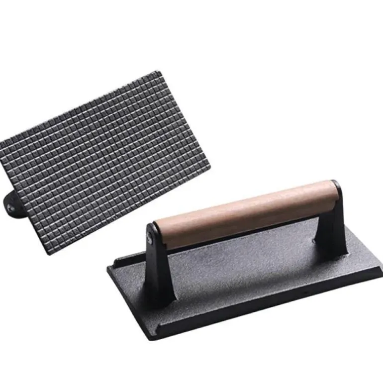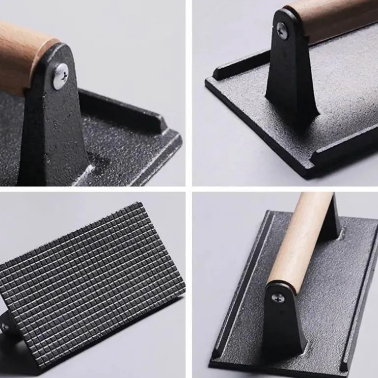 Der robuste Holzgriff liegt gut in der Hand und ermöglicht gleichmäßigen Druck auf verschiedene Fleischstücke, darunter Ribeye, Filet Mignon und Hähnchenbrust. Das durchdachte Design sorgt nicht nur für attraktive Grillstreifen, sondern versiegelt auch Aromen und Säfte – für ein stets saftiges Grillerlebnis.