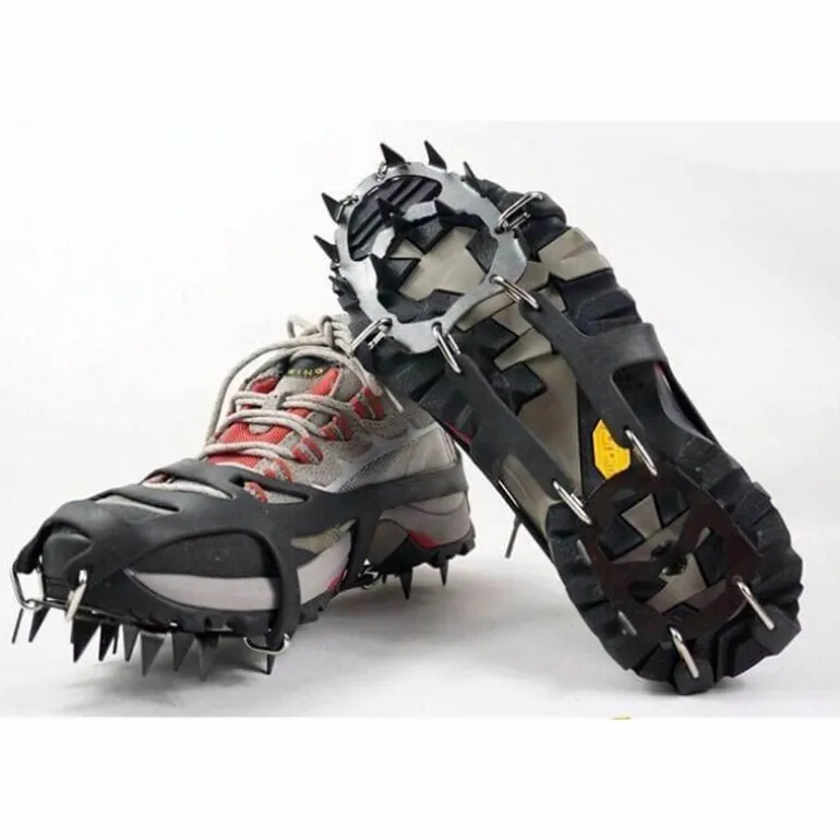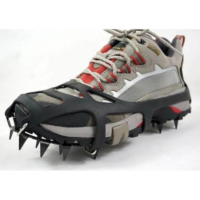 Erleben Sie mehr Stabilität und Sicherheit bei Winterwanderungen mit unseren Steigeisen-Überschuhen. Im Gegensatz zu herkömmlichen rutschfesten Schuhen passen diese Überschuhe direkt über die Schuhsohlen. Sie lassen sich leicht an- und ausziehen und bieten zuverlässigen Halt.
