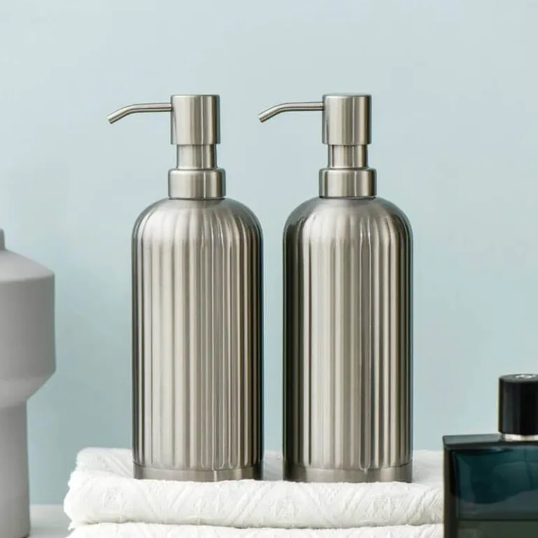 Introducing a modern and stylish striped stainless steel soap dispenser, designed to enhance the functionality of your kitchen or bathroom. Made from high-quality stainless steel, this durable dispenser is easy to clean, ensuring it maintains a sleek and polished look over time.