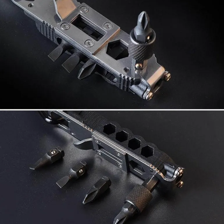 Das Werkzeug umfasst einen kleinen und einen großen Schraubendreher, einen großen und einen kleinen Kreuzschlitzschraubendreher, eine weiße LED-Beleuchtung für Sichtbarkeit bei schwachem Licht, zwei Arten von Sechskantschlüsseln, einen Flaschenöffner und einen Schnellhaken zur einfachen Befestigung.