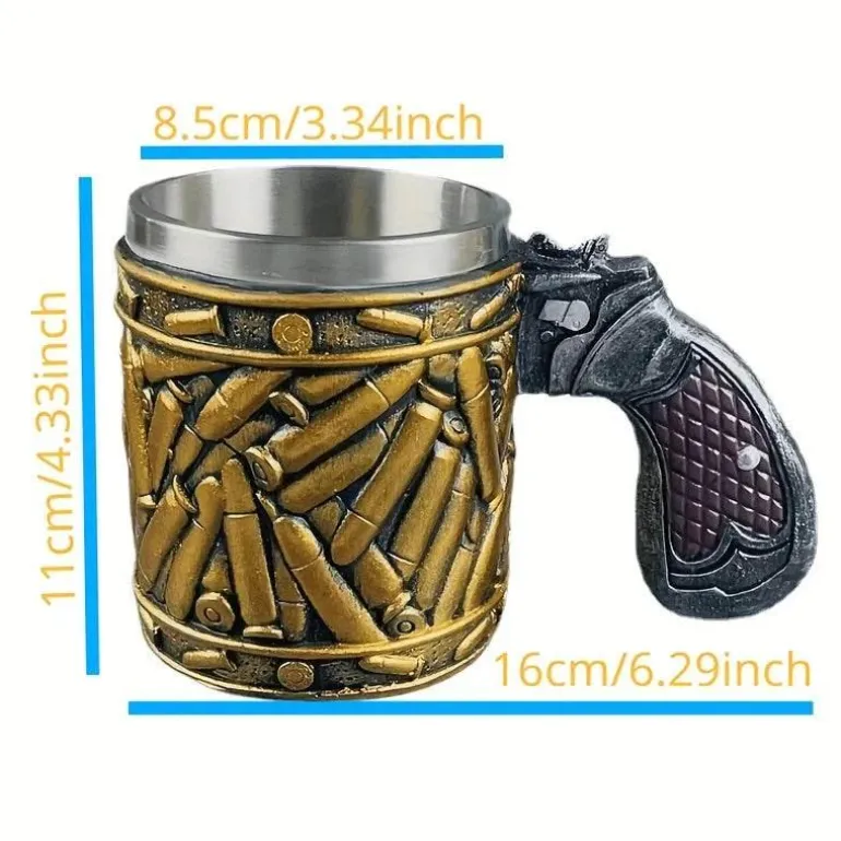 – **Einzigartiges Design:** Der Pistolengriff und die Patronenmotive sorgen für ein auffälliges Erscheinungsbild, das diesen Becher von herkömmlichen Optionen abhebt.