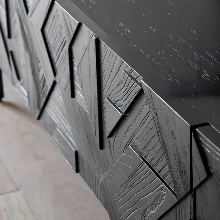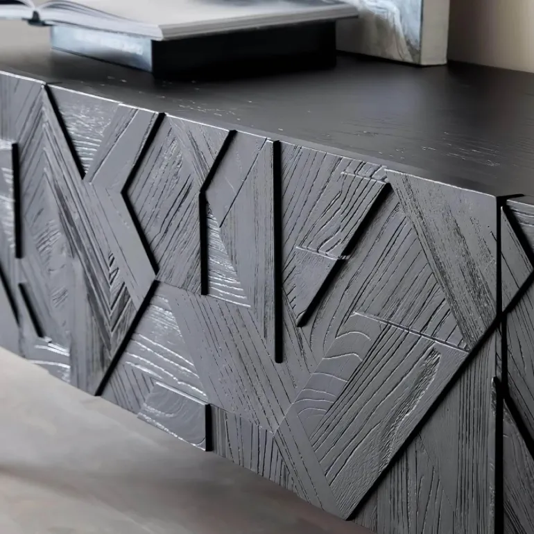 Der Tawaba TV-Schrank vereint auf wunderschöne Weise Stammesinspiration mit handwerklicher Handwerkskunst und ist eine bemerkenswerte Ergänzung für Ihren Wohnraum. Handgefertigt aus hochwertigem Eichenholz besticht dieses Entertainment-Möbel durch aufwendige handgeschnitzte Details, die die reichen Traditionen der Stammeskunst würdigen. Jeder Schrank ist ein Unikat, sodass kein Möbelstück dem anderen gleicht.