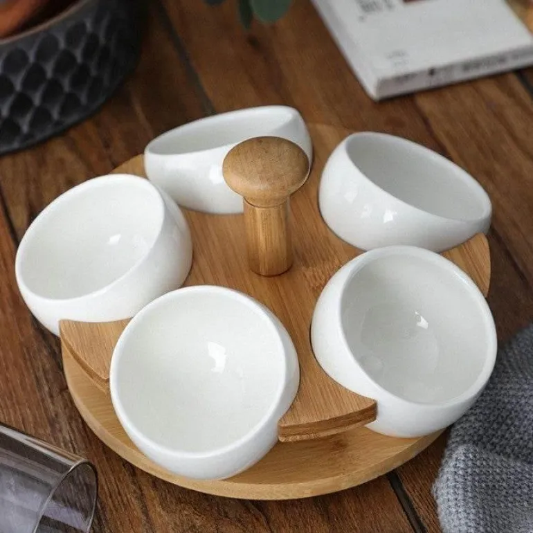 Genießen Sie Ihre Lieblingssnacks und -getränke mit dem eleganten Bambus-Porzellan-Snacktablett. Dieses runde Tablett aus robuster Keramik besticht durch sein schönes und schlichtes Design, das zu jedem Anlass passt. Die durchdachten Fächer eignen sich ideal zum Ordnen verschiedener Snacks, Früchte, Nüsse und anderer Kleinigkeiten und machen es zu einer vielseitigen Ergänzung für Ihr kulinarisches Erlebnis. Das Tablett verfügt außerdem über einen integrierten Tragegriff für mühelosen Transport, egal ob Sie Gäste bedienen oder einen ruhigen Abend zu Hause genießen.