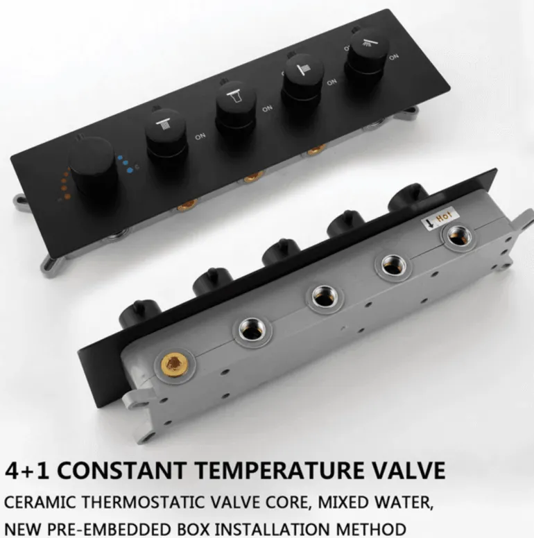 In the box, you will find one waterfall thermostatic massaging rain shower system set, ready to elevate your showering experience to new heights. Transform your daily routine into a moment of relaxation and serenity with this remarkable shower system.