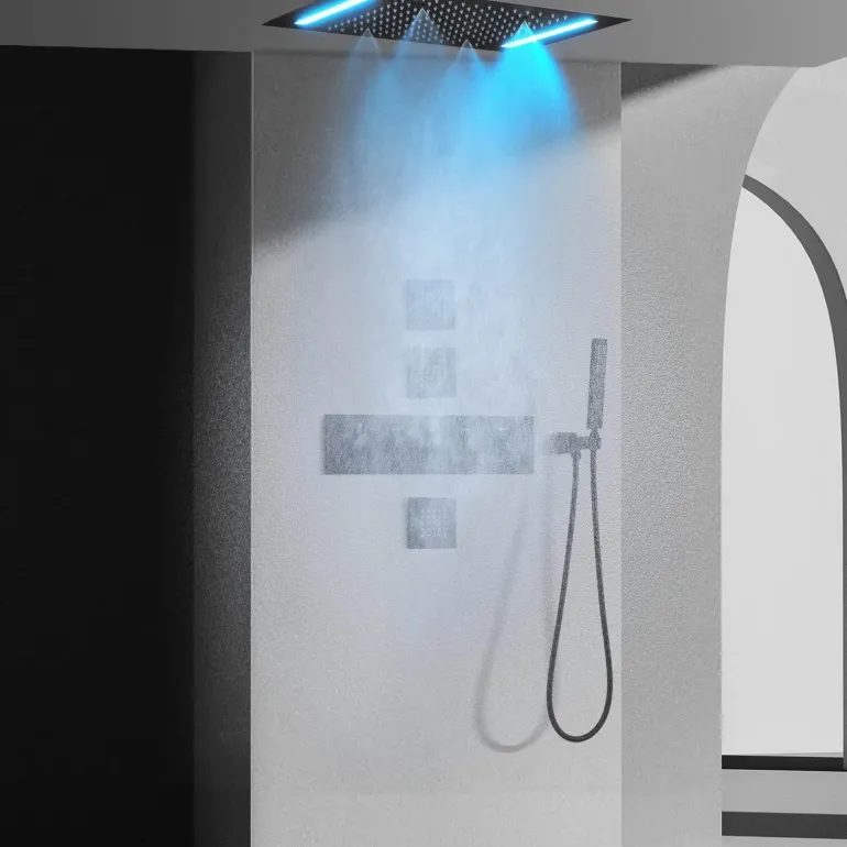 Experience a rejuvenating retreat with this thermostatic rain shower system, featuring a unique massaging waterfall set. This sophisticated shower system is designed to enhance your daily routine, providing a spa-like atmosphere in the comfort of your own bathroom. The thermostatic control ensures a steady water temperature, promoting safety and convenience while you indulge in a soothing shower.