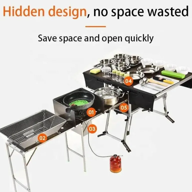 Bereichern Sie Ihre Outdoor-Abenteuer mit unserer vielseitigen, faltbaren Camping-Küchenstation, die speziell für Camper entwickelt wurde, die das Kochen in der Natur schätzen. Diese tragbare Kochlösung vereint Komfort mit Funktionalität und macht die Essenszubereitung unter freiem Himmel zu einem nahtlosen Erlebnis.