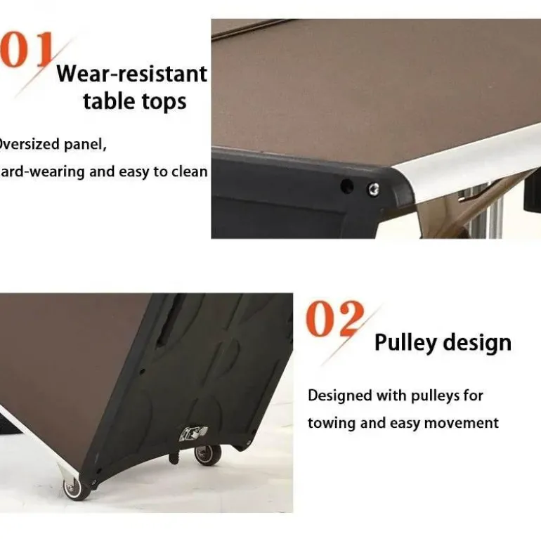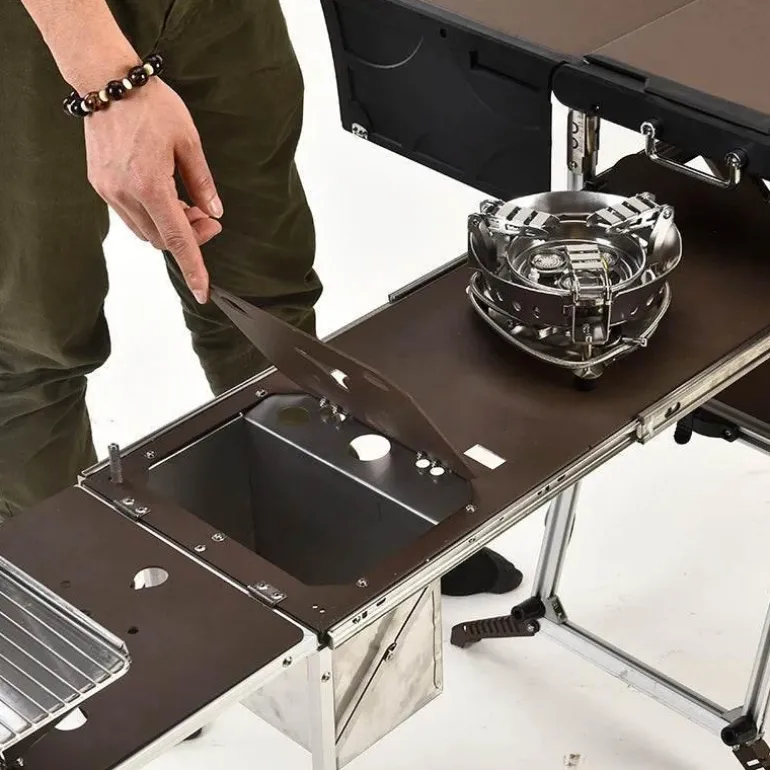 Diese Küchenstation überzeugt durch ihr kompaktes und tragbares Design und lässt sich leicht zu einem Aktentaschen-großen Paket zusammenfalten, sodass Sie sie mühelos zu Ihrem gewählten Campingplatz transportieren können. Der leichte Rahmen aus Aluminiumlegierung erleichtert den Transport, sodass Sie Ihre Outdoor-Aktivitäten genießen können, ohne von sperriger Ausrüstung belastet zu werden.