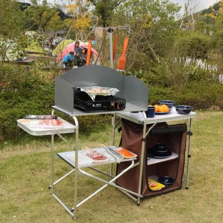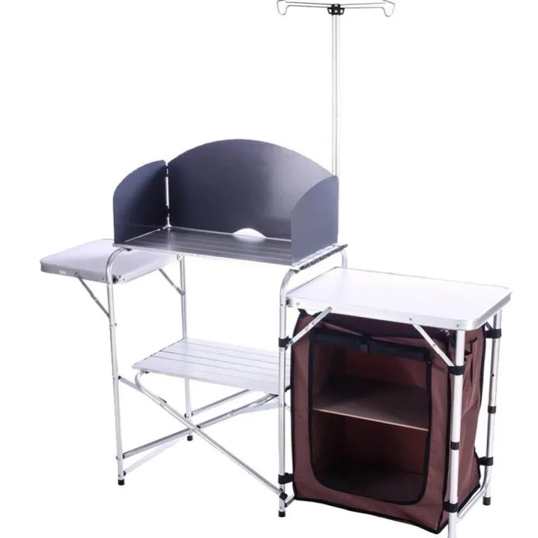 Egal, ob Sie eine herzhafte Mahlzeit zubereiten oder ein Getränk unter den Sternen genießen, diese Campingküche bereichert Ihr Outdoor-Erlebnis und bietet Stabilität und Funktionalität für alle Ihre kulinarischen Bedürfnisse.