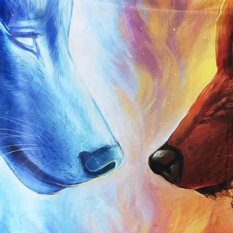 Die Fire and Ice Fleecedecke mit Kapuze besticht durch ein faszinierendes Design von JoJoesArt. Sie zeigt zwei Wölfe in einem dramatischen Duell zwischen Flammen und Eis und verleiht Ihrem Wohlfühlerlebnis eine einzigartige Note. Genießen Sie Wärme und Stil, während Sie sich in diese vielseitige und kunstvolle Kapuzendecke hüllen.