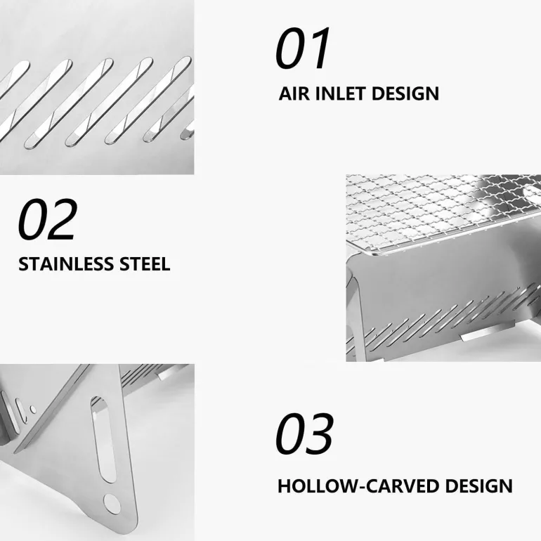 Erleben Sie entspanntes Kochen im Freien mit unserem tragbaren Holzkohlegrill, der speziell für Camping-Fans entwickelt wurde. Der Grill aus robustem Edelstahl ist hitzebeständig, kratzfest und rostfrei und hält so verschiedenen Wetterbedingungen stand, ohne sich zu verziehen. Seine robuste Konstruktion macht ihn zu einem zuverlässigen Begleiter für all Ihre Campingabenteuer.