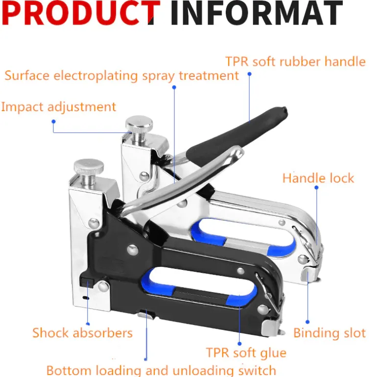 Optimieren Sie Ihre Heimwerker- und Bauprojekte mit unserem tragbaren manuellen Klammerhefter, der auf Effizienz und Benutzerfreundlichkeit ausgelegt ist. Dank seines durchdachten Designs, das Komfort und Funktionalität in den Vordergrund stellt, können Sie mit diesem zuverlässigen Werkzeug anspruchsvolle Aufgaben schnell erledigen. Leicht und dennoch robust, passt er nahtlos in Ihren Werkzeugkasten und sorgt dafür, dass Sie ihn überallhin mitnehmen können, wohin Ihre Projekte Sie führen.