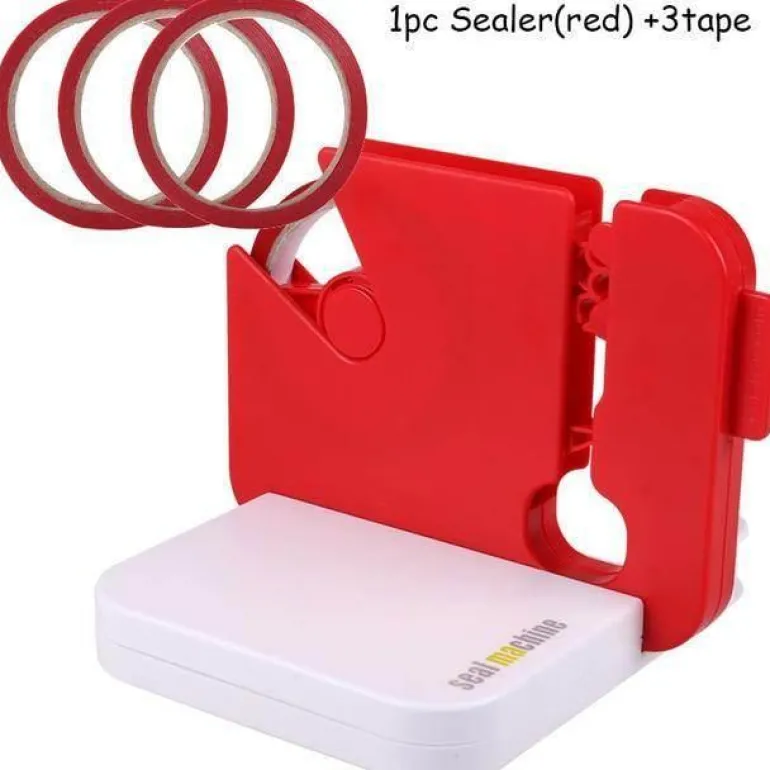 Dieses vielseitige Werkzeug lässt sich einfach an der Seite eines Küchenmöbels befestigen oder im Schrank verstauen, um Platz zu sparen. Die Bedienung des Versiegelers ist unkompliziert; Schritt-für-Schritt-Fotos veranschaulichen das einfache Einlegen des Klebebands. Jedes Gerät enthält 10 Rollen Klebeband für den sofortigen Einsatz.