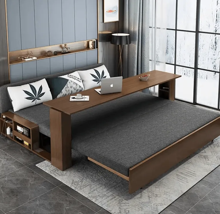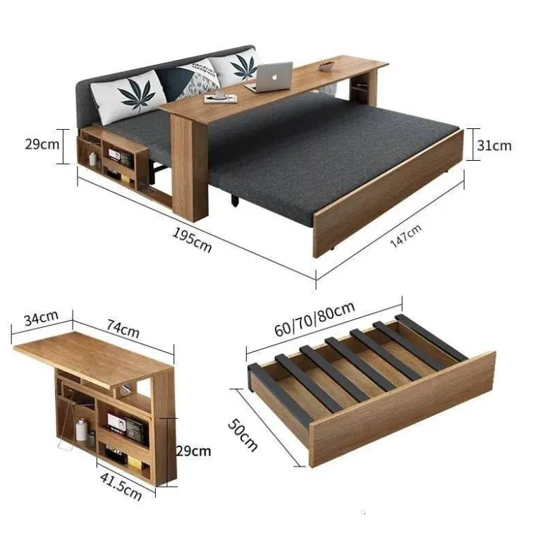 This transformable sofa bed features a contemporary wooden design, providing a smart, space-saving solution ideal for compact living areas. Enjoy a seamless transition from a chic sofa to a cozy bed, complemented by integrated storage that helps keep your essentials neatly organized. Its versatile wooden construction makes it suitable for living rooms, guest rooms, or studio apartments, beautifully merging style with functionality.