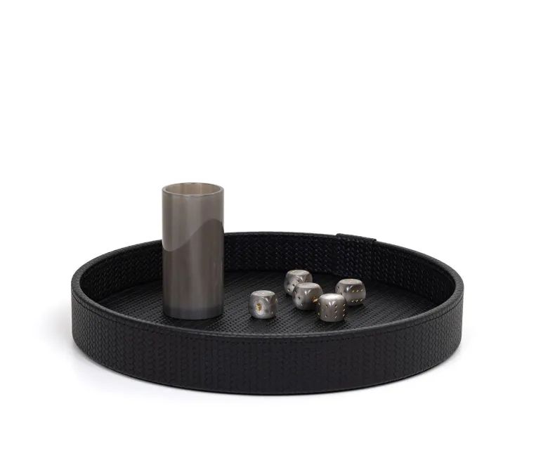 Elevate your game nights with our Gea round tray, crafted from waterproof and scratch-resistant calfskin leather, featuring a non-slip base. This essential design is a refined update on a classic, paired with a custom dice game set. The set includes one shaker and five Pinetti-customized resin dice. Available in a variety of leathers and colors, this piece seamlessly integrates luxury with leisure.