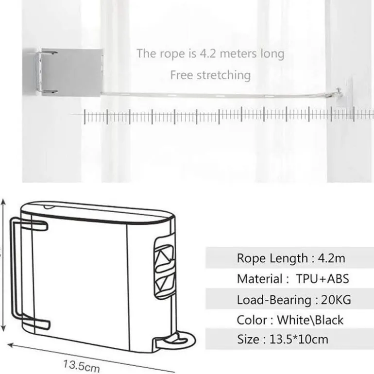 Diese kompakte Wäscheleine verfügt über ein frei einziehbares Design, das Sie auf der gewünschten Länge arretieren können. Sie ist bis zu 4,2 Meter lang und trägt bis zu 20 Kilogramm. Bei Nichtgebrauch lässt sie sich bequem einfahren, um Platz zu sparen.