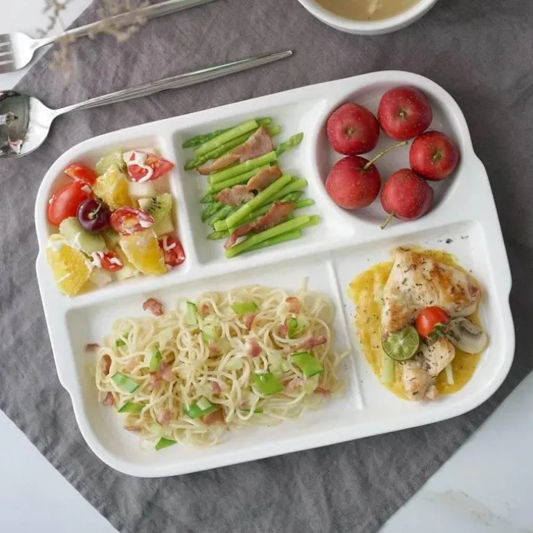 Mit seiner schlanken, rechteckigen Form und dem minimalistischen Design passt dieser Teller perfekt zu jedem Tischgedeck. Die Unterteilung bietet die perfekte Lösung zum Trennen verschiedener Speisen und eignet sich ideal zur Portionskontrolle oder zur Präsentation einer köstlichen Auswahl an Snacks.