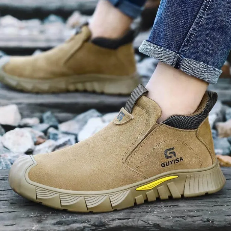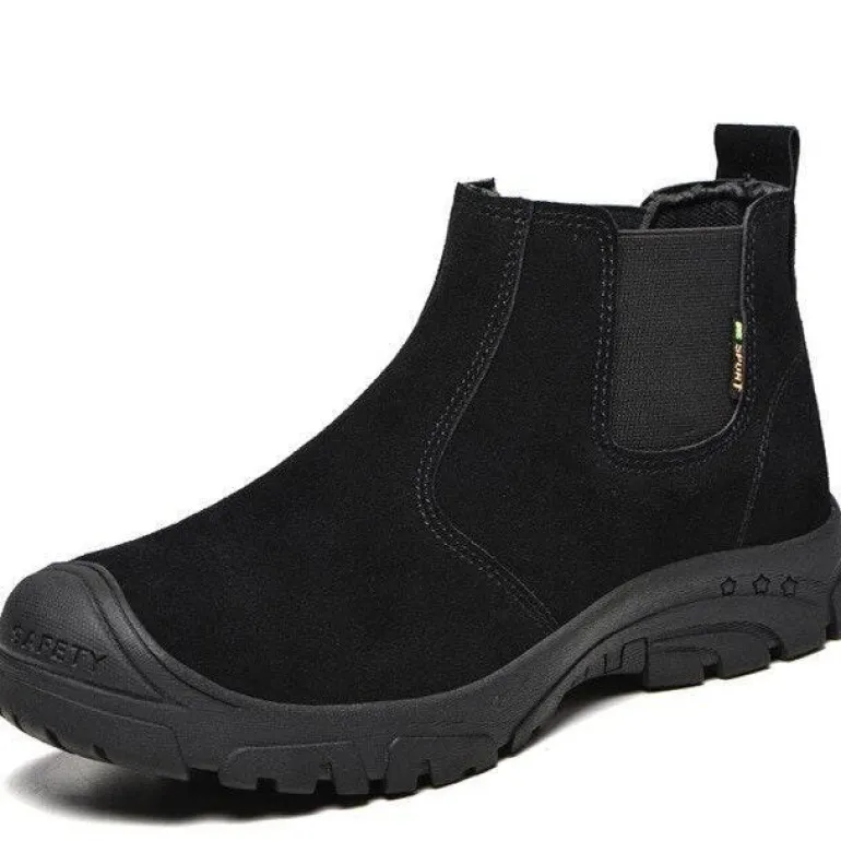 Die Stiefel aus hochwertigem Rindsveloursleder verfügen über eine runde Zehenpartie, die für mehr Sicherheit und eine attraktive Optik sorgt. Das atmungsaktive Baumwollfutter und die Innensohle sorgen für einen weichen Sitz und machen sie ideal für Frühling und Herbst. Das gemischte Farbmuster verleiht ein modernes Flair und sorgt dafür, dass Sie auch bei harter Arbeit gut aussehen.