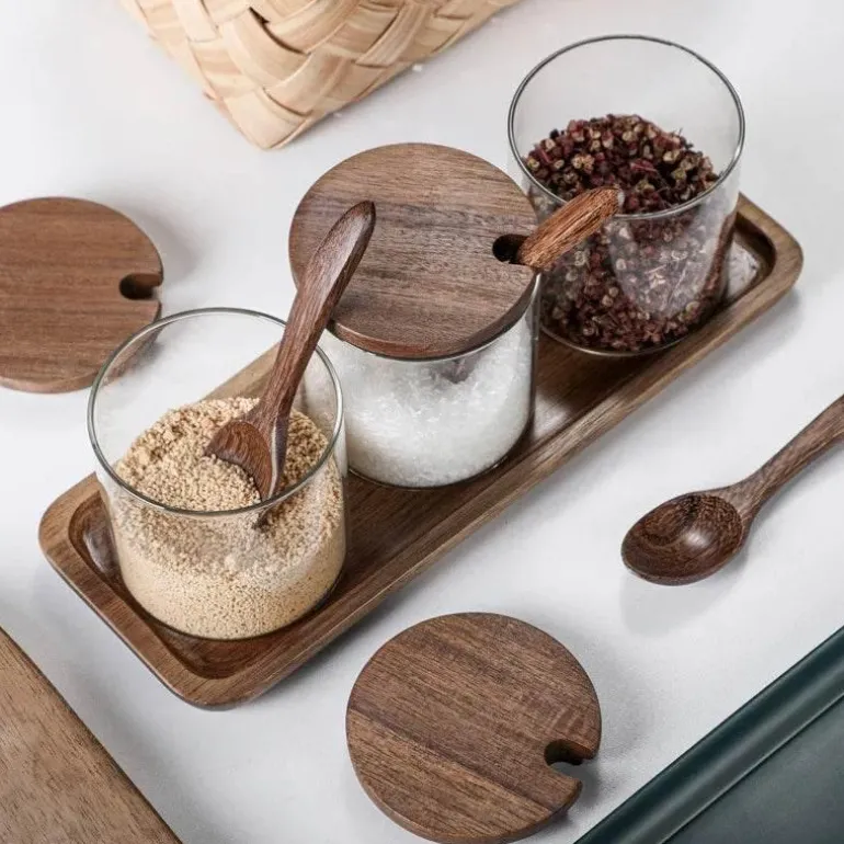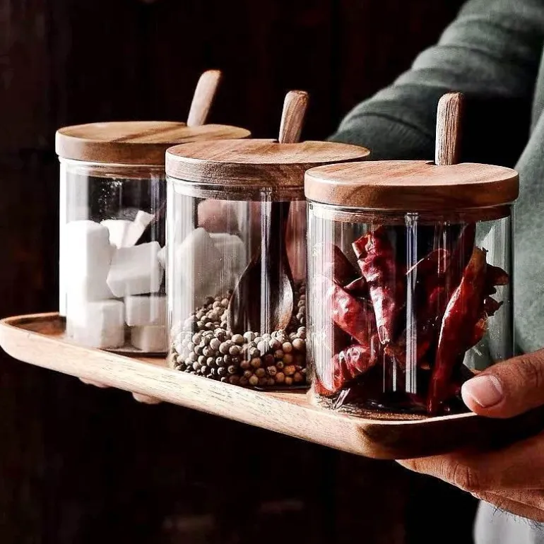 Verschönern Sie Ihre Küche oder Ihren Wohnraum mit diesem dekorativen Set aus Glasvorratsgläsern mit wunderschönem Akazienholzdeckel, der Ihrer Einrichtung einen Hauch natürlicher Wärme verleiht. Dieses vielseitige 3-teilige Set bietet nicht nur praktische Aufbewahrungsmöglichkeiten für Ihre Gewürze, sondern verleiht Ihrem Zuhause auch eine moderne, organische Ästhetik.