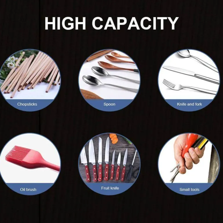 Optimieren Sie Ihren Küchenraum mit dieser kompakten Aufbewahrungslösung. Das schlanke Design verfügt über einen Besteckhalter und einen speziellen Block für Messer, Gabeln und Scheren auf der linken Seite – perfekt für die Organisation wichtiger Küchenutensilien wie Gabeln, Löffel, Essstäbchen, Messer und Scheren.