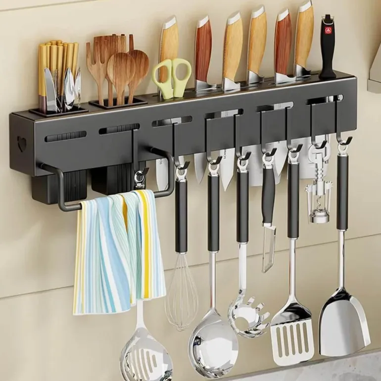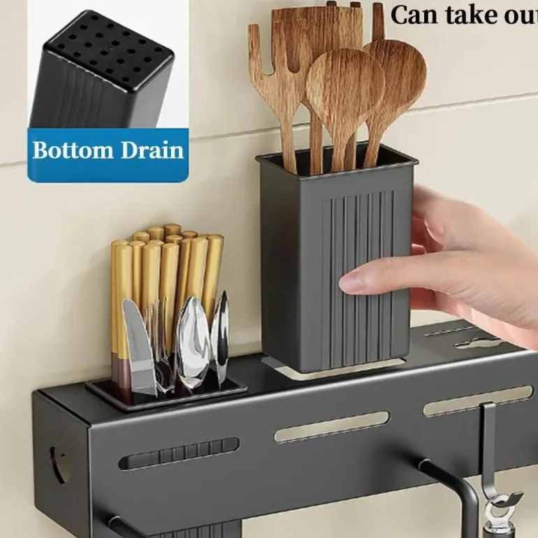 Optimieren Sie Funktionalität und Stil Ihrer Küche mit diesem wandmontierten Küchenorganizer, der die Arbeitsfläche optimal nutzt. Dieser vielseitige Werkzeughalter dient als zentrale Anlaufstelle für Ihre wichtigsten Utensilien und Kochutensilien und sorgt dafür, dass alles, was Sie brauchen, bequem erreichbar ist.