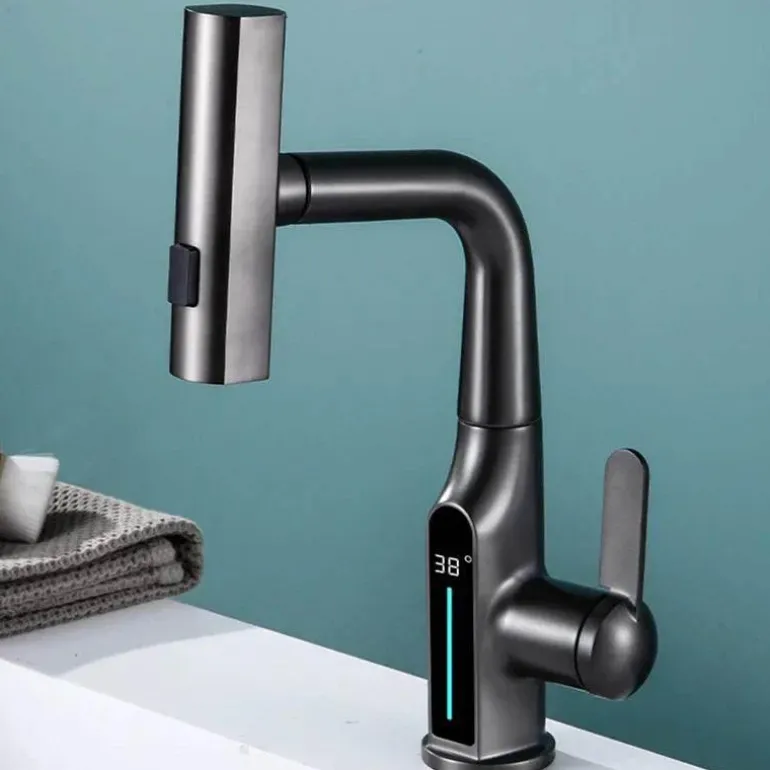 Im Paket enthalten ist ein anhebbarer Wasserfall-Waschtischhahn mit digitaler Temperaturanzeige, der Ihr Badezimmer verschönern wird.