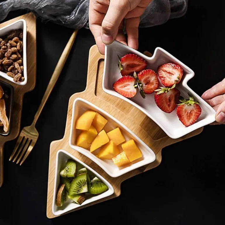 Dieses vielseitige Serviergeschirr eignet sich ideal für eine Vielzahl von Snacks, darunter Nüsse, Trockenfrüchte, Vorspeisen und Saucen und ist somit eine wunderbare Ergänzung für jeden festlichen Anlass. Das abnehmbare Bambusbrett trägt nicht nur zur Ästhetik bei, sondern ist auch leicht zu reinigen und zu montieren, sodass ein problemloses Servieren gewährleistet ist.