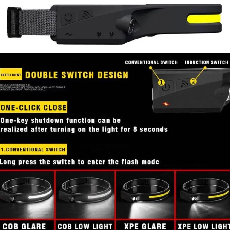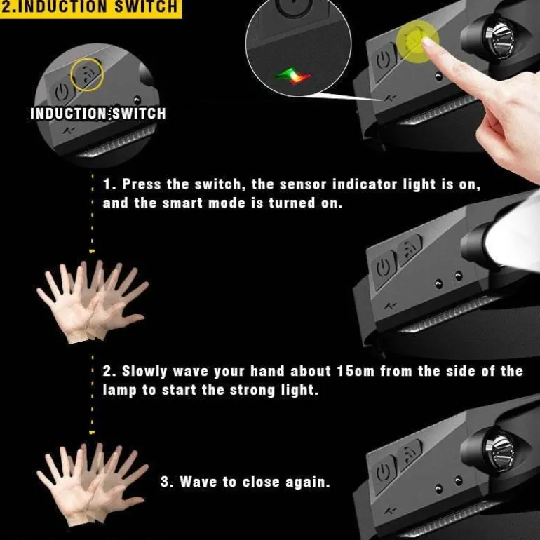 Ausgestattet mit intelligenter Sensortechnologie ermöglicht diese Stirnlampe eine freihändige Bedienung. Sie können das Licht mühelos ein- und ausschalten, indem Sie Ihre Hand in der Nähe des Induktionsbereichs um den Schalter bewegen. Um diese Funktion zu nutzen, stellen Sie sicher, dass die Stirnlampe und der Induktionsschalter gleichzeitig aktiviert sind.
