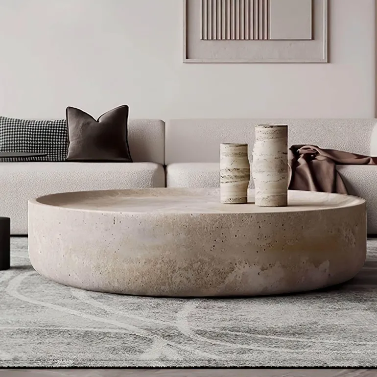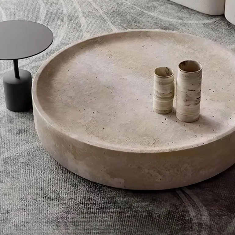 Entdecken Sie den Zariah Travertin Couchtisch, ein atemberaubendes Herzstück, das Luxus und Eleganz vereint. Dieser runde Tisch ist fachmännisch aus massivem Travertin gefertigt und besticht durch seine reiche natürliche Textur und einzigartige Maserung, die seine zeitlose Eleganz unterstreicht. Mehr als nur ein funktionales Objekt, ist er ein Statement erlesenen Geschmacks und wertet mit seiner opulenten Präsenz mühelos das Ambiente Ihres Wohnraums auf.